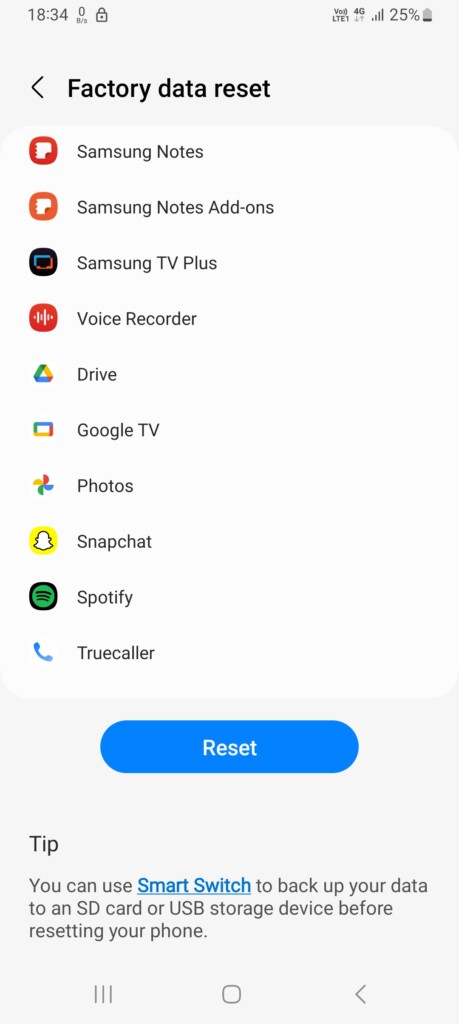 4.Scrollen Sie nach unten und tippen Sie aufZurücksetzenTaste. Wenn Sie eine Bildschirmsperre verwenden, werden Sie nach dem Passwort gefragt. Sobald Sie es eingegeben haben, wird der Vorgang auf Ihrem Telefon gestartet.