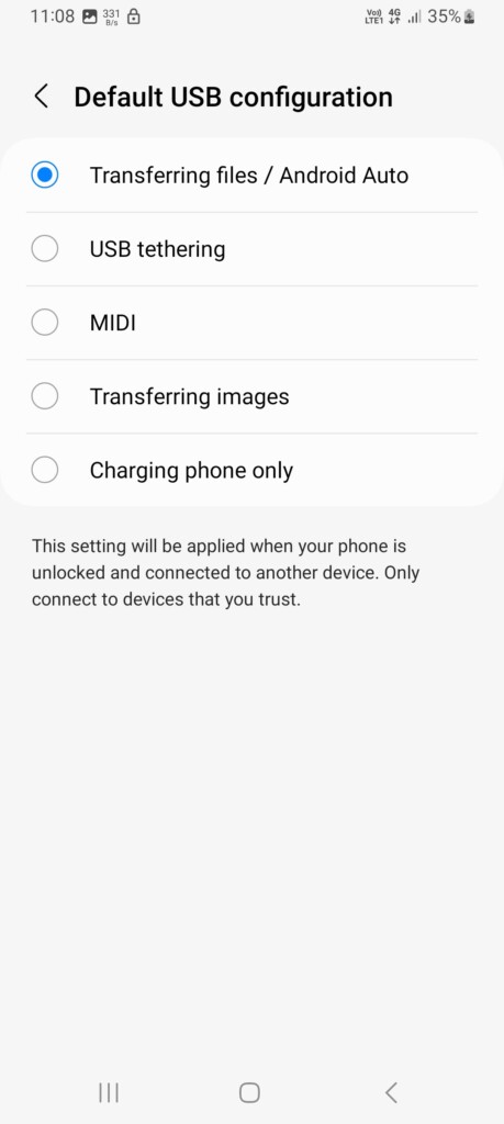 Bei einigen Smartphones wird diese USB-Einstellung jedes Mal zurückgesetzt, wenn Sie das Telefon vom PC trennen. Wenn dies bei Ihrem Smartphone ebenfalls der Fall ist, führen Sie die folgenden Schritte ausÜbertragen von Dateien/Android Autodie Standardoption für die USB-Verbindung.