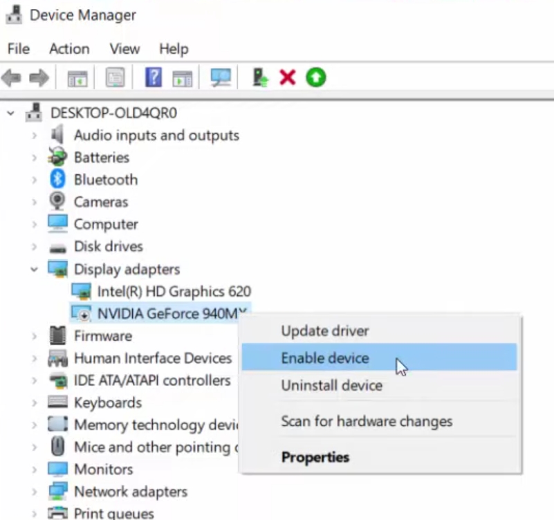 3.Klicken Sie mit der rechten Maustaste auf die NVIDIA-Grafikkarte und suchen Sie nachAktivierenOption. Wenn diese Option angezeigt wird, ist Ihre NVIDIA-Grafikkarte deaktiviert. Klicken Sie aufAktivierenum die Grafikkarte zu aktivieren.