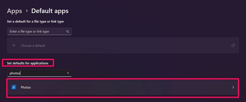 3.Verwenden Sie die Suchleiste untenLegen Sie Standardeinstellungen für Anwendungen festAbschnitt zum Suchen nach Fotos undklicken Sie daraufaus den Suchergebnissen.