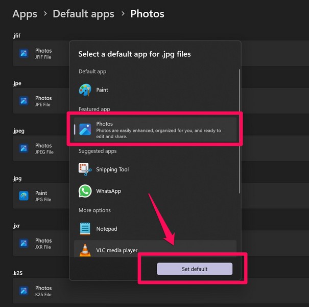 5.Auf die folgende Eingabeaufforderung hin:Wählen Sie die Fotos-App ausund klicken Sie aufStandard festlegenKlicken Sie auf die Schaltfläche für jede der Dateitypoptionen in der Liste.