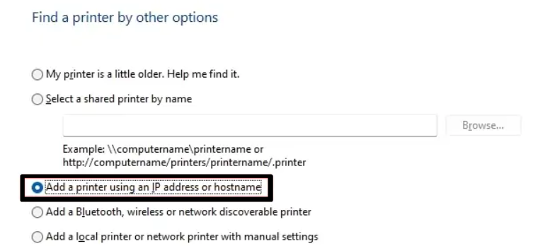 4.Wählen Sie als Nächstes die ausFügen Sie einen Drucker mithilfe einer TCP/IP-Adresse oder eines Hostnamens hinzuOption auf derDrucker hinzufügenprompt.