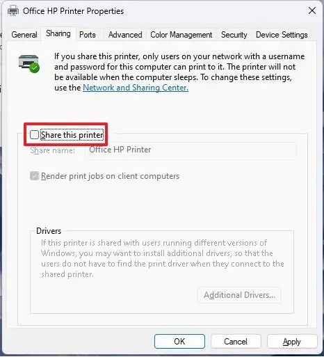 4.Deaktivieren Sie dann das KontrollkästchenTeilen Sie diesen DruckerOption in derTeilenAbschnitt und klicken Sie aufAnwendenKlicken Sie auf die Schaltfläche, um die Änderungen zu speichern.