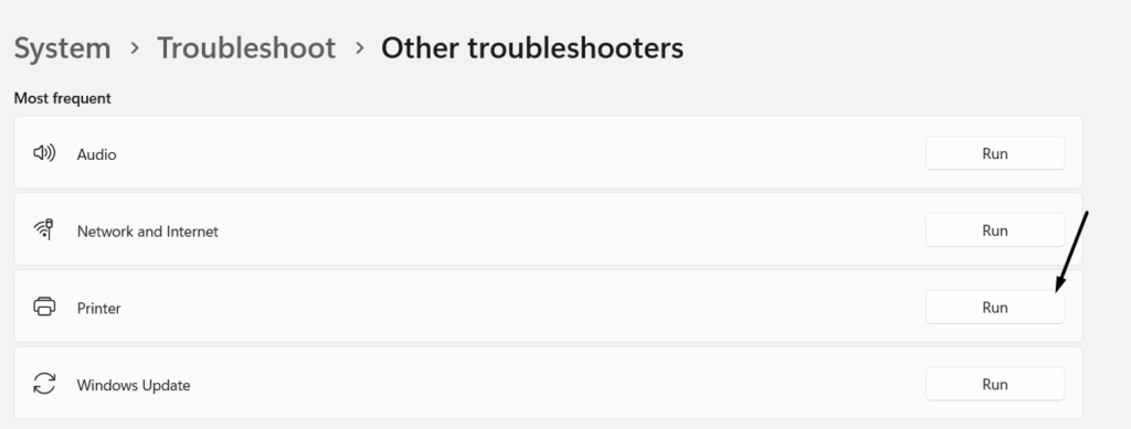 Das neueste Windows 11 verfügt über eine integrierte Drucker-Fehlerbehebung, mit der Sie Probleme mit dem angeschlossenen Drucker und den Komponenten, die für die ordnungsgemäße Funktion sorgen, finden und beheben können. Also überlegen SieAusführen der Drucker-Fehlerbehebungauf Ihrem Windows 11-PC und prüfen Sie, ob das Problem dadurch behoben wird. Sie können den unten aufgeführten Schritten folgen, um zu erfahren, wie Sie dieses Tool ausführen: