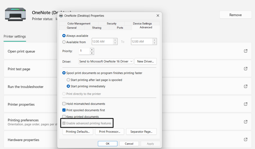 3.Gehen Sie zumFortschrittlichTab und deaktivieren Sie das KontrollkästchenAktivieren Sie das erweiterte Drucken MerkmaleOption.