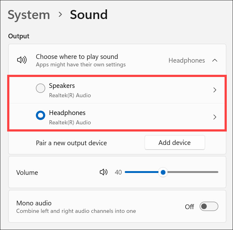 2.Klicken Sie unter der Überschrift „Ausgabe“ aufWählen Sie, wo der Ton abgespielt werden soll.