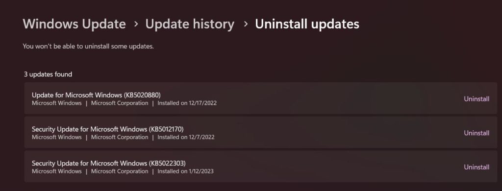 Sie sehen nun eine Liste der letzten Windows-Updates. Wählen Sie das neueste Update aus und klicken Sie auf die Schaltfläche „Deinstallieren“ daneben.