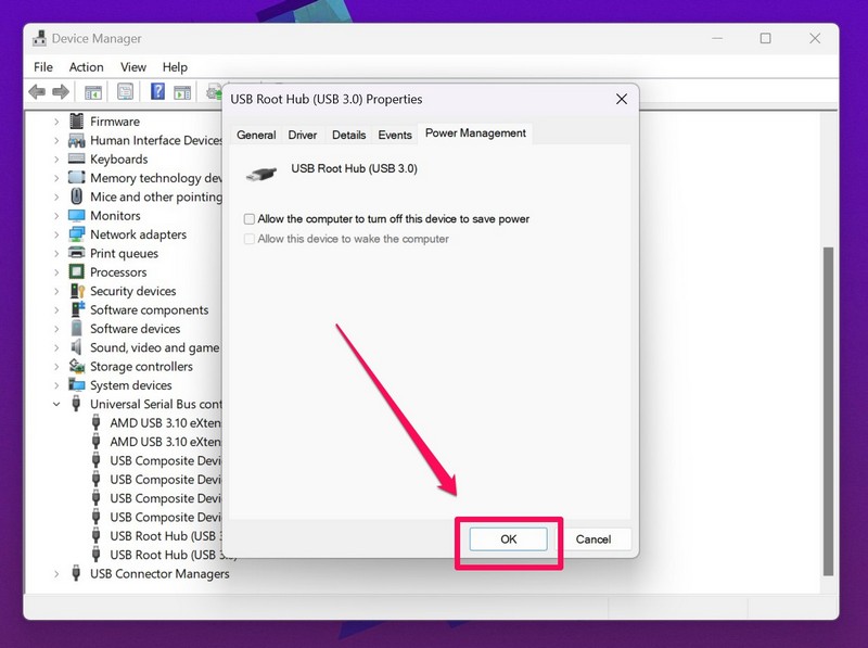 8. Ändern Sie die Energieverwaltungseinstellungen für den USB-Root-Hub in Windows 11