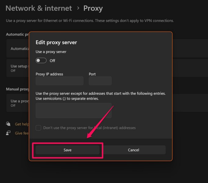 6.Schließlich klicken Sie auf dieSchaltfläche speichernunten speichern und beenden Sie das manuelle Proxy -Setup -Fenster.