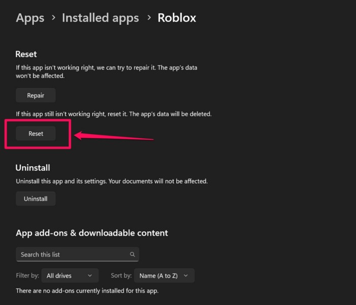 Das Problem der Roblox-Arbeit kann auch durch technische Störungen und Fehler auf Ihrem Windows 11-PC oder -Laptop verursacht werden. Wenn dies der Ansicht ist, dass das Problem auf Ihrem Gerät das Problem verursacht, können Sie versuchen, die Roblox-App mit den integrierten Tools in Windows 11 zu reparieren und zurückzusetzen. Schauen Sie sich die folgenden Unterabschnitte an, um zu erfahren, wie Sie die Roblox-App auf Ihrem PC oder Laptop reparieren und zurücksetzen.