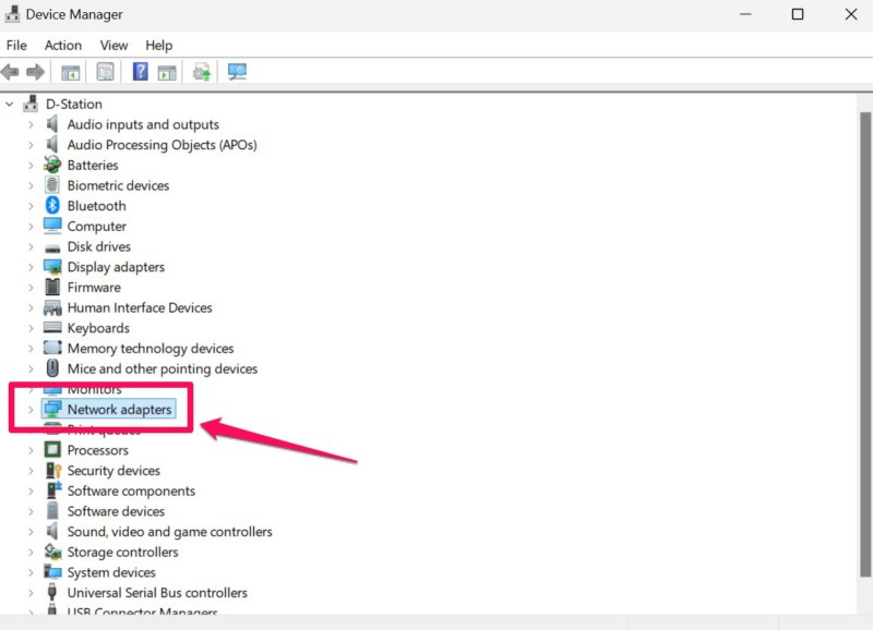 3.Suchen Sie dieNetzwerkadapterAbschnitt innerhalb des Geräte -Manager -Fensters undKlicken Sie auf den Pfeil, um ihn zu erweitern.