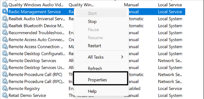 3.Klicken Sie mit der rechten Maustaste auf einen der genannten Dienste und wählen Sie den ausEigenschaftenOption aus dem Kontextmenü.