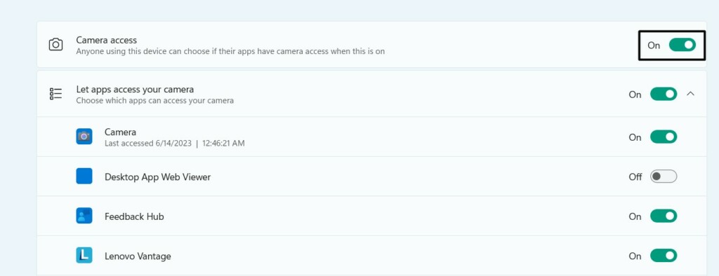 4.Stellen Sie sicher, dass der Schalter neben dem stehtSkype-AppimErlauben Sie Apps, auf Ihre Kamera zuzugreifenAbschnitt ist eingeschaltet.