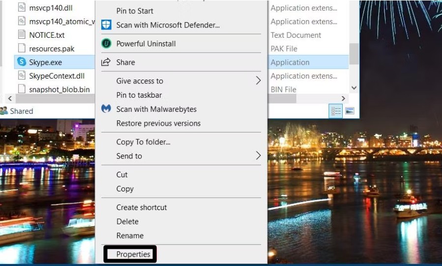 C:Program FilesWindowsAppsMicrosoft.SkypeApp_15.92.3204.0_x86__kzf8qxf38zg5cSkype2.Sobald Sie dort sind, klicken Sie mit der rechten Maustaste aufSkype-App, und wählen SieEigenschaftenaus dem Kontextmenü.