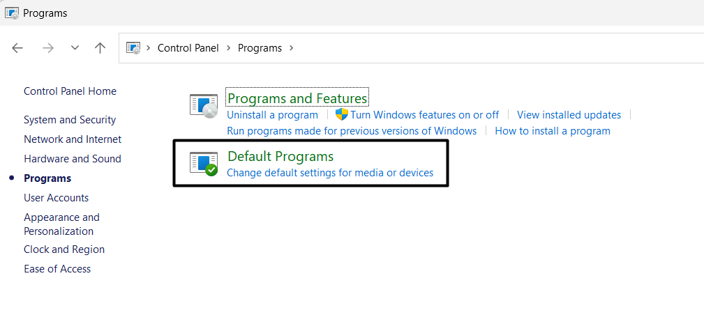 2.ImProgrammeFenster, wählenStandardprogrammeund wählen Sie dann die folgende Option: