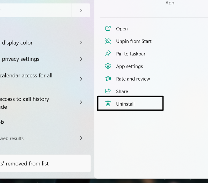 2.Wählen Sie dieDeinstallierenOption aus den Suchergebnissen, um mit der fortzufahrenInstallierte AppsFenster.