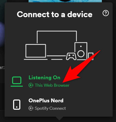 Mit Spotify können Sie das Gerät zum Abspielen Ihrer Musik manuell auswählen. Stellen Sie sicher, dass Sie Spotify so eingestellt haben, dass es Ihren Webbrowser für die Musikwiedergabe verwendet. Ist dies nicht der Fall, wechseln Sie das Gerät und Ihr Webplayer beginnt zu funktionieren.