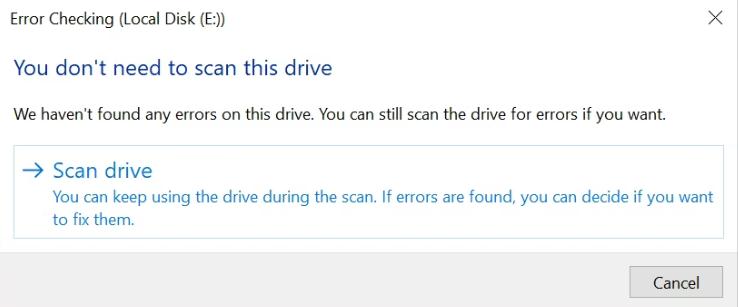 Ob Windows Fehler auf dem Laufwerk festgestellt hat, wird Ihnen angezeigt. Sie können das Laufwerk scannen, um alle erkannten Probleme zu beheben. Andernfalls warnt Windows Sie davor, dies zu tun. Klicken Sie jedoch im Dialogfeld einfach auf Laufwerk scannen, wenn Sie die Festplatte trotzdem scannen möchten. Als Ergebnis beginnt der CHKDSK-Scan.
