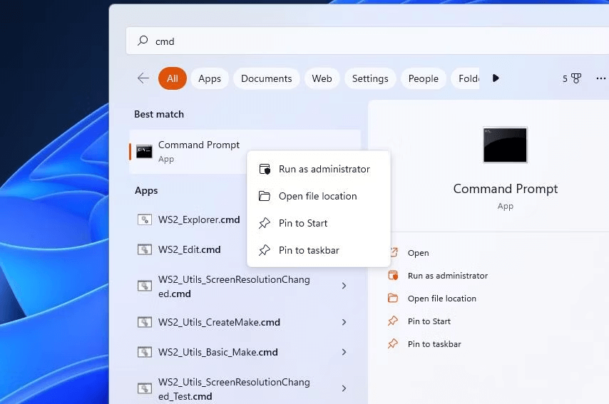 Schritt 2:Geben Sie CMD ein und die Eingabeaufforderungs-App wird mit einigen Optionen angezeigt. Wählen Sie die Option „Als Administrator ausführen“.