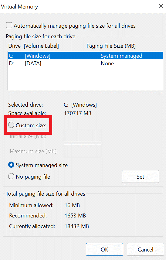 Schritt 7:Wählen Sie als Nächstes die ausBrauchGröße. Legen Sie die maximale Größe Ihrer Auslagerungsdatei fest und beachten Sie dabei die vom System empfohlene Größe.