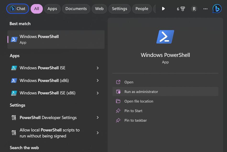 Schritt 1: Tippen Sie auf das Suchsymbol in der Taskleiste, geben Sie „PowerShell“ ein und wählen Sie die Option „Als Administrator ausführen“, um die App im Administratormodus zu starten.