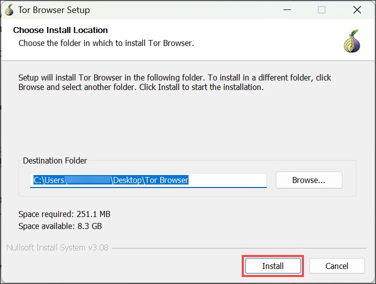7.Als nächstes wird Ihnen die Möglichkeit geboten, das Verzeichnis auszuwählen, in dem Sie den Tor-Browser installieren möchten. Standardmäßig wählt das Installationsprogramm den entsprechenden Speicherort aus, Sie können ihn jedoch bei Bedarf ändern. Klicken Sie aufInstallierenTaste.