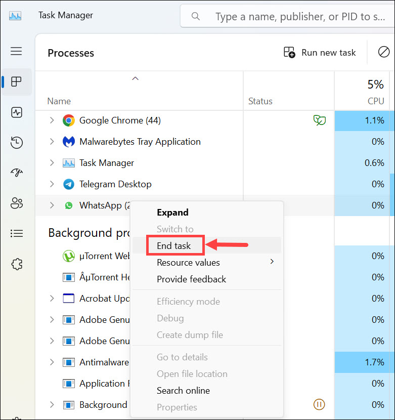 Wenn die grundlegenden Schritte zur Fehlerbehebung nicht funktionieren, müssen Sie möglicherweise einen Neustart Ihrer WhatsApp Desktop-App erzwingen. Gehen Sie dazu folgendermaßen vor: