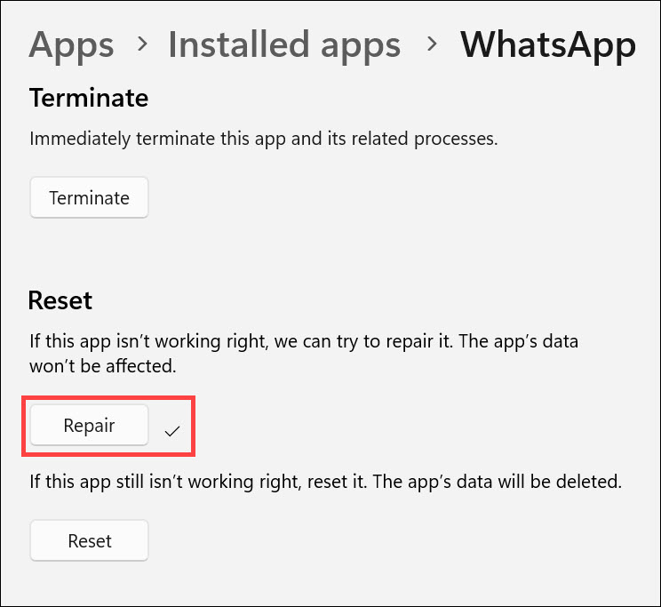 6.Das System beginnt mit der Reparatur der WhatsApp-App und nach Abschluss wird neben der Schaltfläche „Reparieren“ ein Häkchen angezeigt.