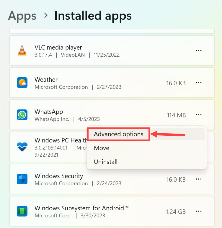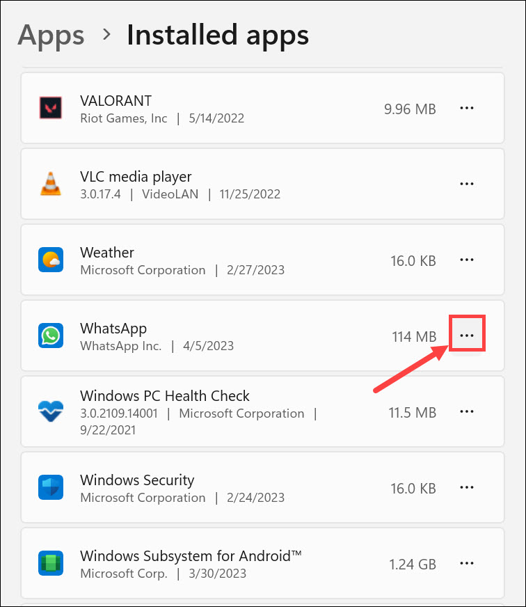 3.Suchen Sie nach demWhatsAppApp und klicken Sie auf die „drei Punkte“ daneben.