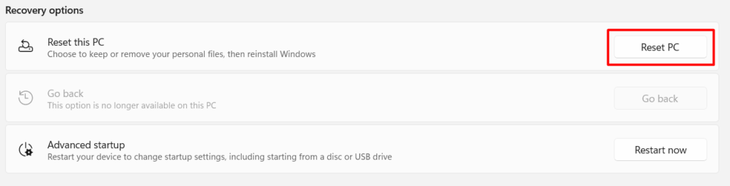 2.Klicken Sie aufPC zurücksetzenunter demSetzen Sie diesen PC zurückAbschnitt.