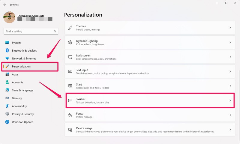 2.Gehe zumPersonalisierungKlicken Sie in der linken Navigationsleiste auf die Registerkarte und klicken Sie dann aufTaskleisteOption im rechten Bereich.