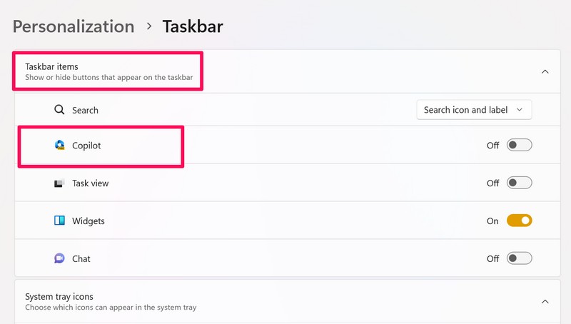 3.Stellen Sie auf der folgenden Seite sicher, dass der Schalter für dieKopilotOption unter derElemente der TaskleisteAbschnitt istermöglichtauf Ihrem PC oder Laptop.