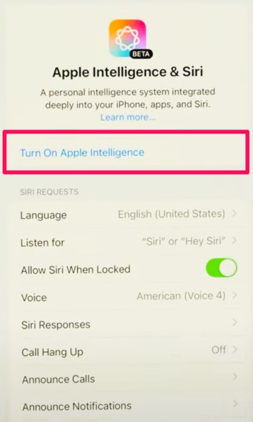 - Klicken Sie nun auf „Apple Intelligence & Siri“ > stellen Sie dann sicher, dass die Sprache auf US-Englisch eingestellt ist.