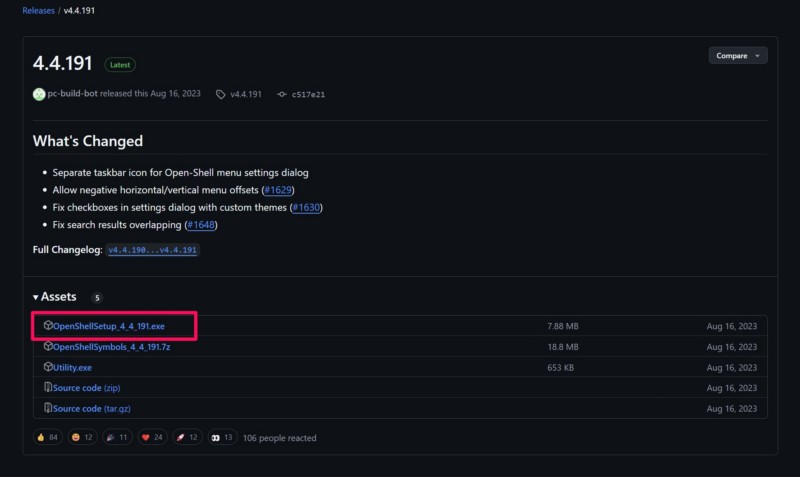 2.Klicken Sie auf der folgenden Seite aufOpenShellSetup_4_4_191.exeDatei zum Herunterladen.