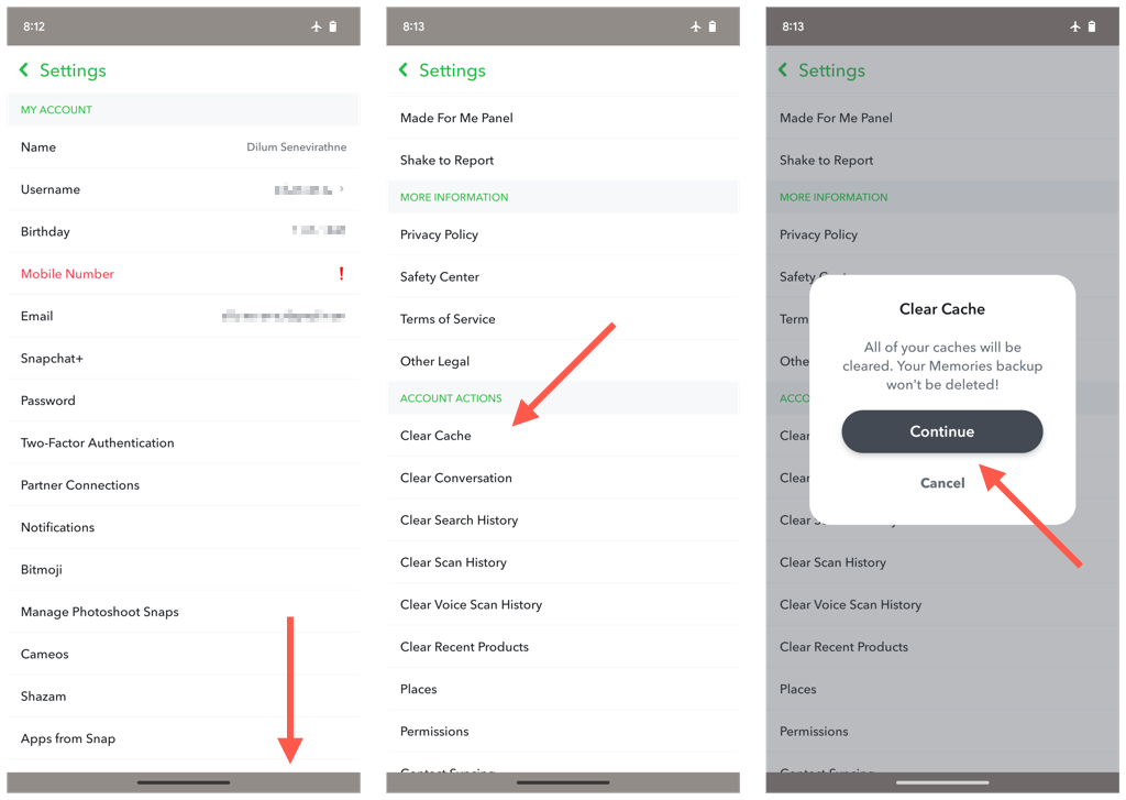 Eine alternative Möglichkeit, das Senden von Lesebestätigungen auf Snapchat zu vermeiden, besteht darin, die Internetverbindung mit der Flugmodusfunktion Ihres Telefons zu unterbrechen. Sobald Sie mit dem Lesen der Nachrichten fertig sind, müssen Sie den Snapchat-Cache leeren, die App aus dem Speicher beenden, die Internetverbindung wiederherstellen und Snapchat entfernen und neu installieren. Ja – es erfordert viel Aufwand!