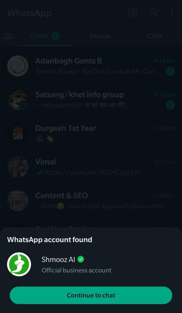 - Sobald Sie auf diese Schaltfläche tippen, wird WhatsApp sofort gestartet und zeigt den Namen an„Shmooz AI“oben auf der Benutzeroberfläche.