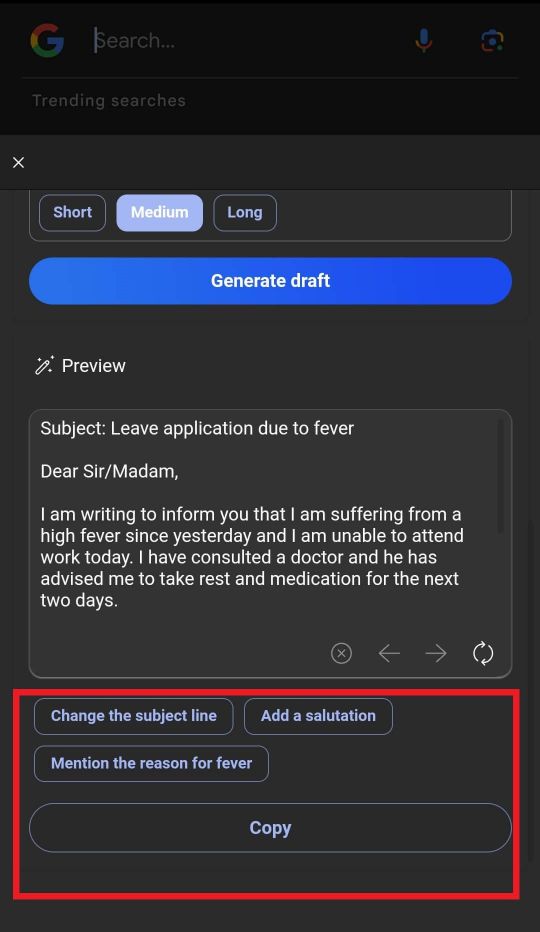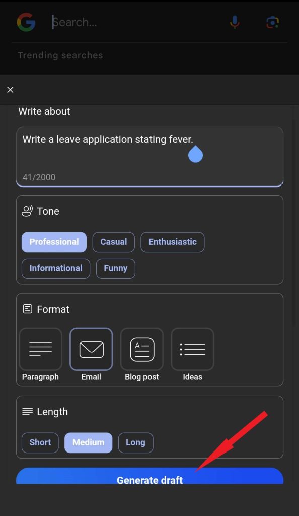 Tippen Sie auf die Option „Verfassen“ und bitten Sie sie, etwas Ihrer Wahl zu schreiben. Mit den Optionen Ton, Format und Länge zur Auswahl. Tippen Sie nun auf die Schaltfläche Entwurf erstellen.