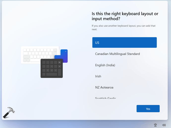 12.Wählen Sie als Nächstes Ihr Tastaturlayout oder Ihre Eingabemethode aus und klicken SieJa.