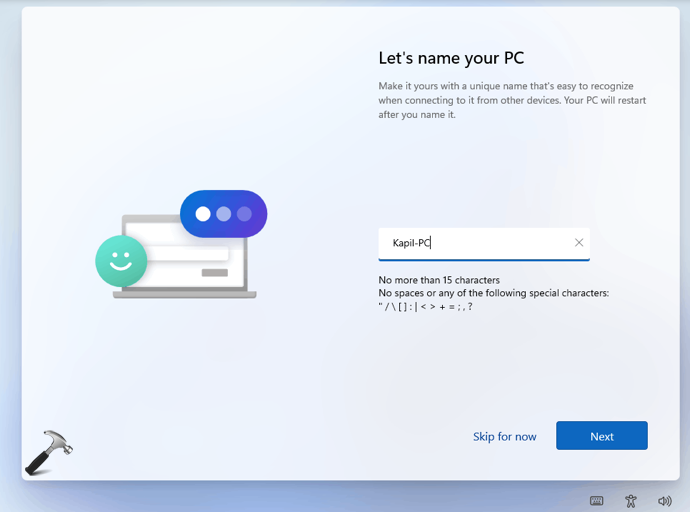 16.In wenigen Augenblicken erhalten Sie einen Bildschirm, auf dem Sie Ihrem PC einen Namen geben können. Geben Sie einen Namen für Ihren PC ein und klicken Sie auf Weiter. Danach wird das System neu gestartet. Wenn Sie möchten, können Sie auch zunächst auf „Überspringen“ klicken, wenn Sie die Benennung Ihres PCs später vornehmen möchtenmit dieser Anleitung.