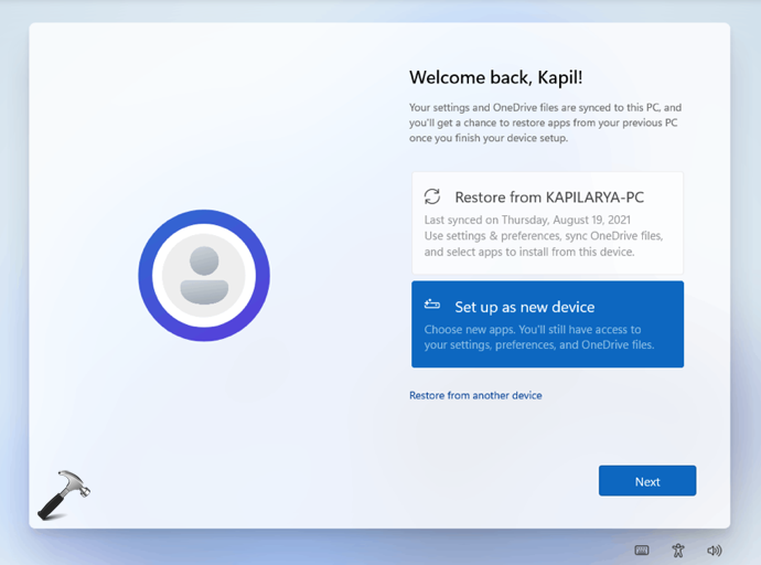 22.Wenn Sie dieses Microsoft-Konto zuvor auf einem Ihrer Systeme verwendet haben, werden Sie gefragt, ob Sie Dateien von OneDrive wiederherstellen möchten. Wenn Sie keine Wiederherstellung wünschen, können Sie auf klickenAls neues Gerät einrichten.