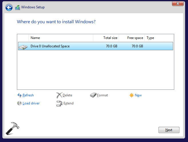 8.Wählen Sie nun die Festplatte aus, auf der Sie Windows installieren möchten. Dieses Laufwerk sollte über 64 GB groß sein.