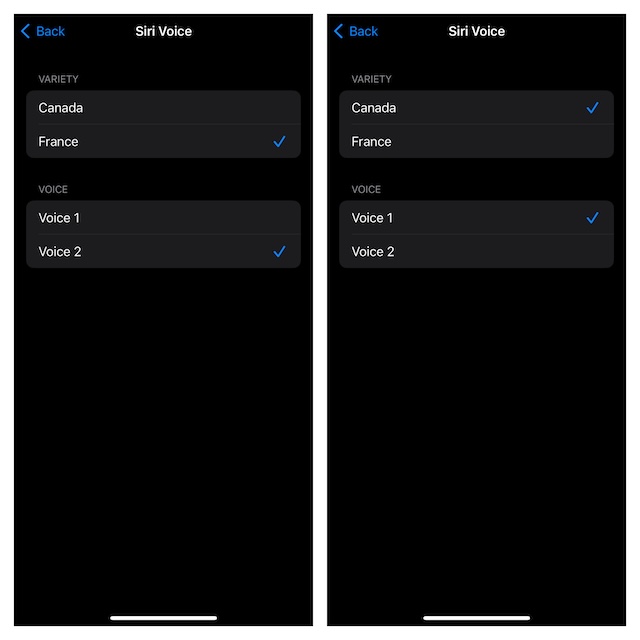 - Wenn Sie die heruntergeladene Sprache verfeinern möchten, tippen Sie darauf und wählen Sie dann die bevorzugte Variante und Stimme aus. Beachten Sie, dass nicht alle Sprachen die Möglichkeit haben, Benutzern die Anpassung von Vielfalt und Stimme zu ermöglichen.