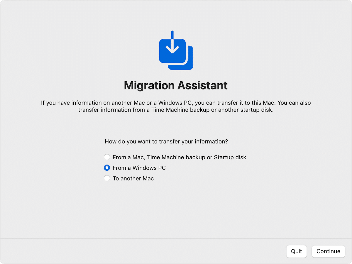 - Installieren Sie den Migrationsassistenten auf einem Windows-PC für macOS Ventura und macOS Monterey vonHier.