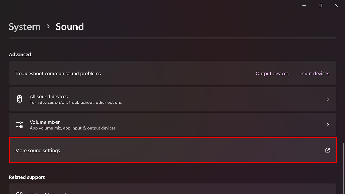 - Scrollen Sie nach unten > unter „FortschrittlichKlicken Sie im Abschnitt auf die Schaltfläche „Weitere Soundeinstellungen”-Option.