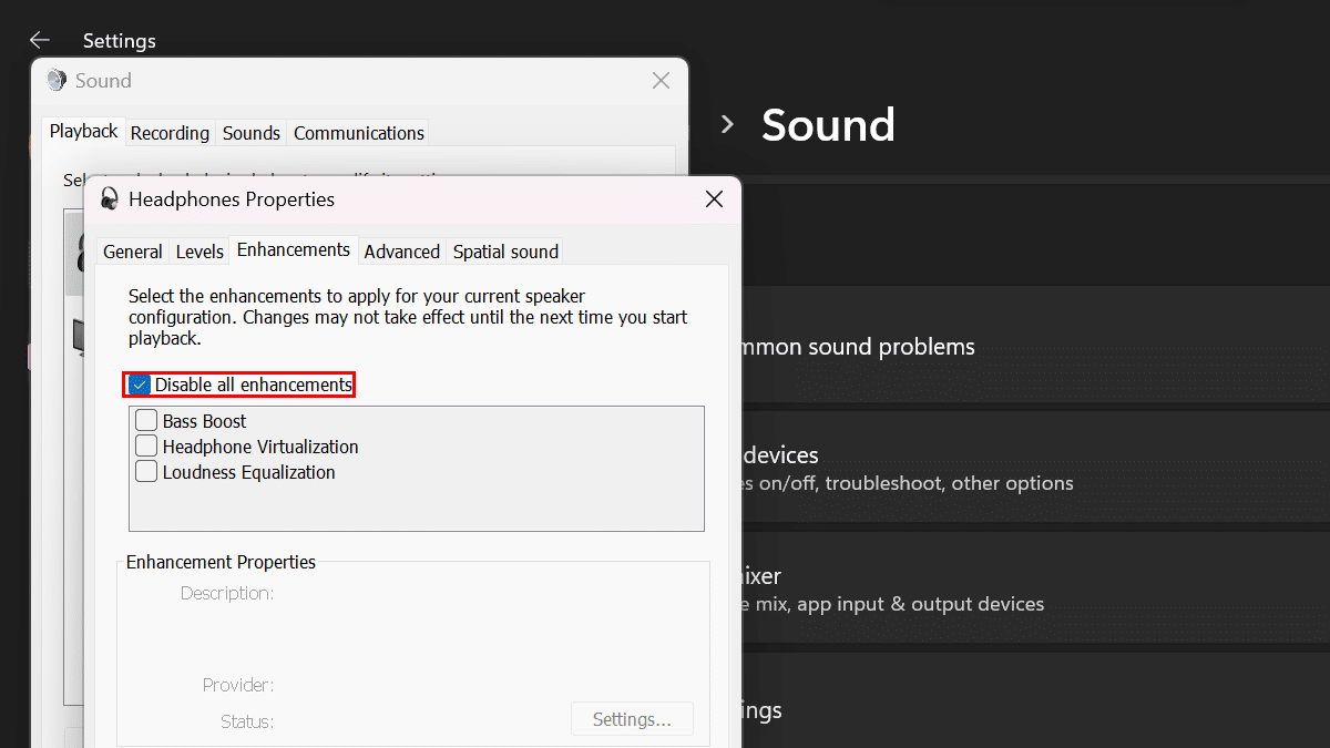 - Klicken Sie aufVerbesserungenRegisterkarte und löschen Sie dann das „Deaktivieren Sie alle Verbesserungen”-Option.