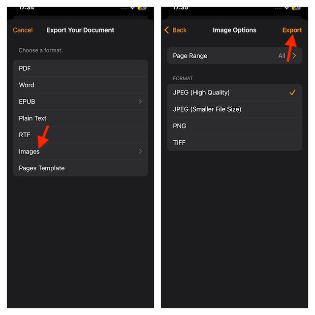 - Wählen Sie anschließend den Seitenbereich und das Bildformat aus und tippen Sie zur Bestätigung auf „Exportieren“.