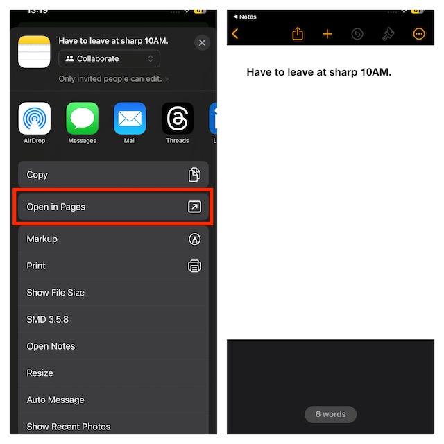 - Tippen Sie anschließend im Menü auf „In Seiten öffnen“. Das ist erledigt! Ihre Notiz wird nun in der Pages-App geöffnet. So können Sie je nach Bedarf Änderungen vornehmen.