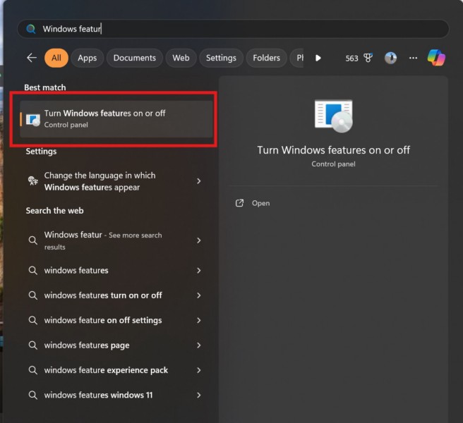 2.Geben Sie Windows-Funktionen in das Textfeld ein und klicken Sie aufOption zum Aktivieren oder Deaktivieren von Windows-Funktionenauf der Suchergebnisseite.