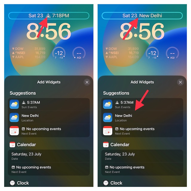 Während ein Satz von Widgets darauf ausgelegt ist, dass Sie das Widget-Feld anpassen können, das unter der Uhrzeit angezeigt wird, ist der andere Satz von Sperrbildschirm-Widgets darauf ausgelegt, Ihnen die Gestaltung des kleinen Bereichs zu ermöglichen, der direkt über der Uhrzeit angezeigt wird.