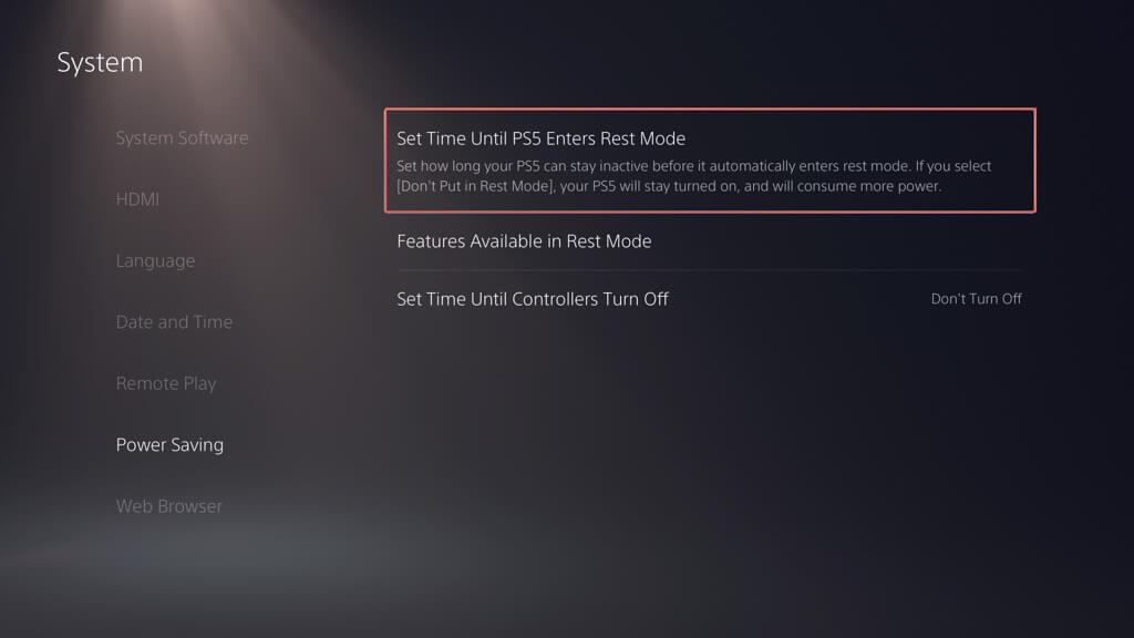 - Gehe zuEnergiesparen>Stellen Sie die Zeit bis zum Start der PS5 einRuhemodus.